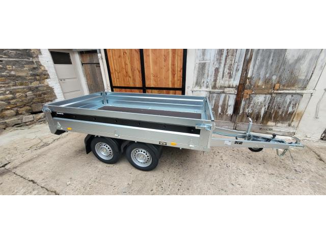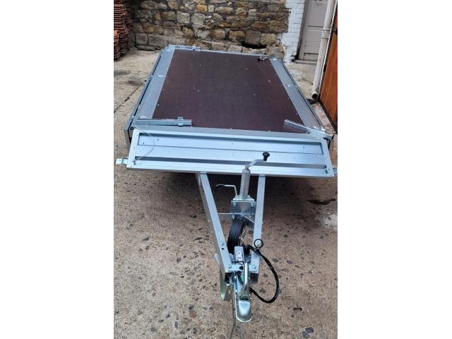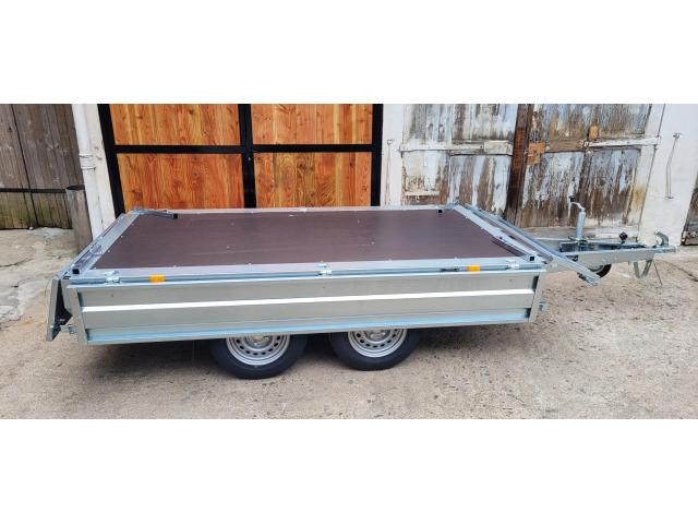 Remorque 2 essieux 750kg ( pas besoin de permis e) avec ridelles démontable pour faire un plateau ou charger avec des fourchettes une palette ou autre.
