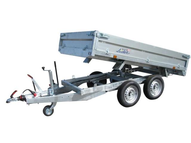 Remorque Lider benne basculante à pompe manuelle double action, freinée, deux essieux, 4 poignées intérieures d'arrimage, plancher lisse, antivol remorque. Chèque de caution en dépôt, non encaissé sauf dégradation.