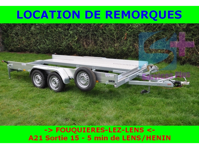 Loue remorque plateau porte voiture de PTAC 1400 kg pour le transport ou le dépannage de véhicules de moins de 1090 Kg. Remorque 2 essieux disposant de 2 rampes de montée de 2,40m, un treuil, une cale de roue, une roue jockey et une roue de secours.