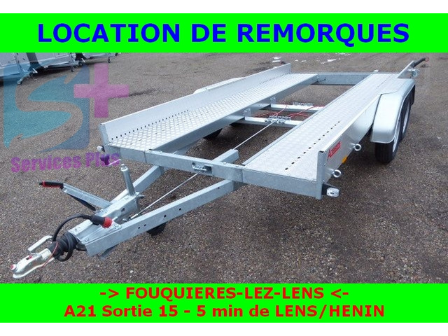 Loue remorque porte voiture de PTAC 2000 kg. Remorque plateau fixe à 2 essieux avec 2 longues rampes de montée. Cette remorque dispose d'une cale de roue sur toute la largeur, d'un treuil, d'une roue jockey, d'une roue de secours fixée et cadenas antivol. Formation B96 minimum.