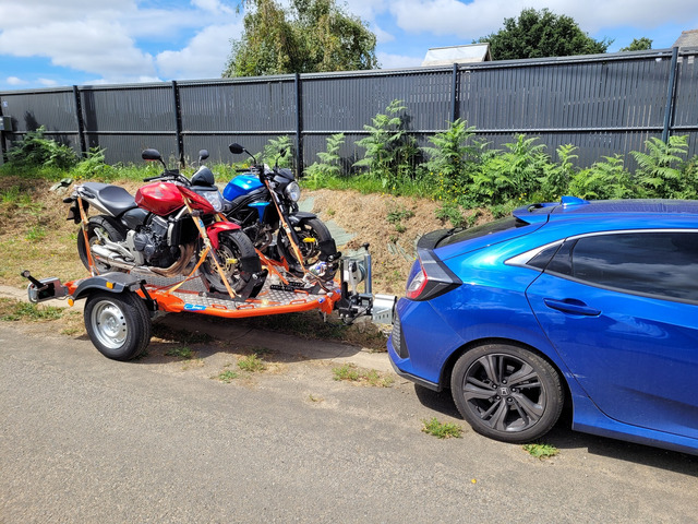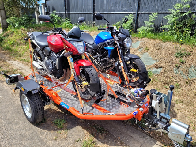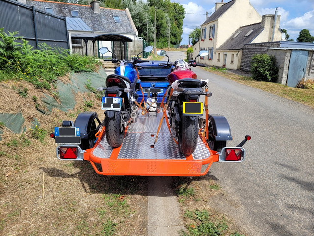 Location de remorque basculante COCHET à louer pour transport de 2 motos toutes tailles jusque 350 kg.